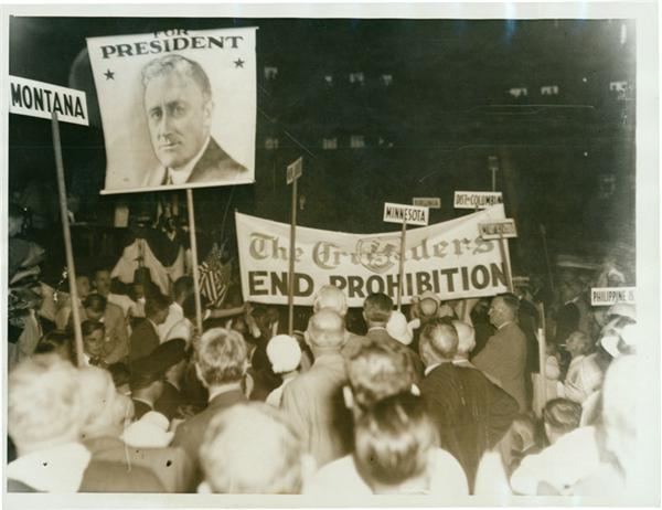 One of the main tenets of Roosevelt's platform was to end Prohibition which he did. Here they are demonstrating for such on the floor of the 1932 Democratic National Convention in Chicago. International News stamp on the verso. Original paper caption. EX-MT. 7x9".