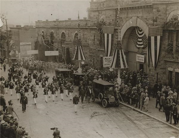 Stunning image of the front of this historic venue, the Fifth Maryland Regiment Armory. Wonderful detail of this Confederate stronghold with simply marvelous atmosphere. Stunning silver gelatin print. International News stamp on the verso. Strong EX+. 7x9".