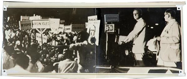 It was a pivotal moment in the life of our future President. He was to nominate Al Smith for the Presidential election at the 1928 Democratic National Convention in Houston and needed to walk out to the rostrum. He went supported by his leg braces and the trained muscular arms of his sons and was able to give the appearance of walking. Here he stands erect and proud; proof positive that he could withstand the rigors of the Presidency four years later. This panorama is 17x7" and folded. Otherwise EX-MT. AP markings.
