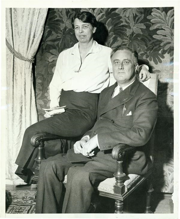 Stunning portrait of the President and the First Lady. They are to attend the upcoming nuptials of their son Franklin Jr. to a member of the DuPont family who does not share FDR's political beliefs. International News stamp on the verso. Original paper caption. EX-MT. 8x10".