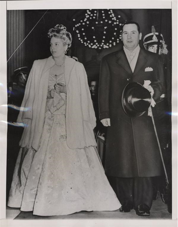 The first formal appearance of this elegant pair since the Argentinean President took office. They are at the Teatro Colon in Buenos Aires for a performance for Foreign Diplomats. Wide World wire photo with original paper caption. EX-MT. 7x9".