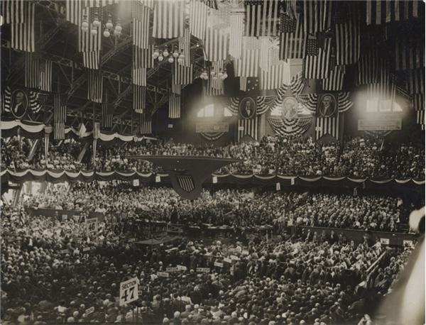 Fabulous image of the Bull Moose Party (Progressive Party) convention in Chicago where Theodore Roosevelt broke off and formed his own party. This is the key moment at the convention when Roosevelt is addressing the vast throngs of delegates. The look is illustrious, from the visual pageantry of the American flags to the banners of Washington, Lincoln and Jefferson. Original paper caption. EX+. 7x9".