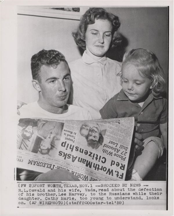 Fascinating photographic archive of about 34 photos of the family of Lee Harvey Oswald centering on his wife Marina. Most interesting is the image of Oswald's brother and Marina after he defected in 1959 (pre-assassination). Plus other images of Marina: college graduation, Warren Commission, interviews, attending mass, trying to see him and leaving jail after visiting Lee Harvey (2), release of Warren Commission Report, and more. Plus, Oswald's brother appearing before and later agreeing with Warren Commission Report (2), and a handful of Oswald's mother such as in court and with the Report. Overall EX to EX-MT. Overall 7x9".