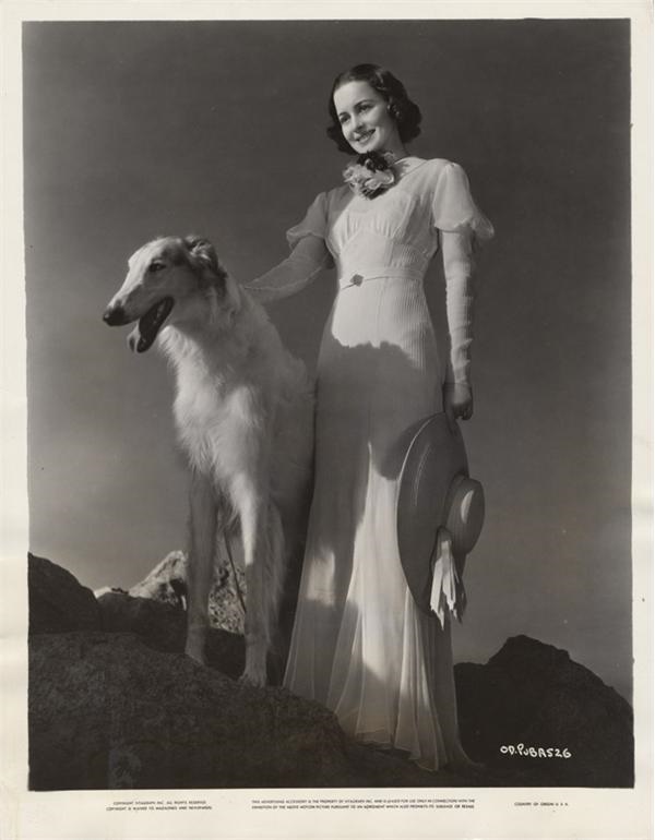 Stunning shot of Olivia DeHaviland with Russian wolfhound named Peter the Great. They are both set to appear in the film "It's Love I'm After". Original paper caption. EX-MT. 8x10".
