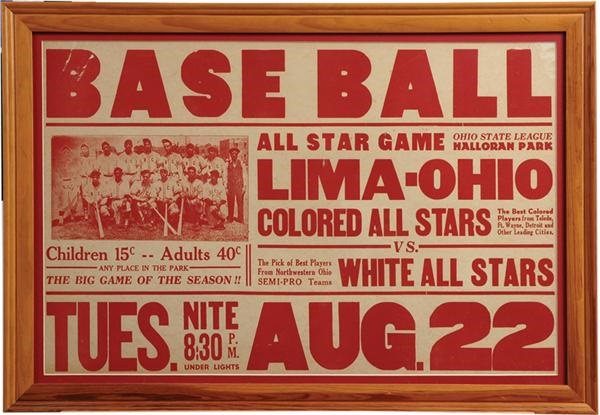 Broadside advertising of an upcoming game between the Lima Ohio Colored All Stars (pictured), which included top players from the Toledo, Ft. Wayne, and Detroit area, against the White All Stars, a team comprised of semi-pro players from the Northwestern Ohio area. The single color sheet exhibits strong color and the image, with the exception of a single player (printing error), is relatively crisp. Overall EX. Matted and framed to 20x29".
