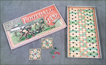 If a finer example of this rare and supremely collectible board game exists, we sure haven't seen it. Box top, with its wonderful image of bareheaded tacklers, is a very conservative EX-MT+. Open the box to find two cardboard spinners, which show the wear of hours of game use but are solid and untorn. Playing surface is bright and beautiful, with only a bit of denting to spare it from a NRMT rating. All original playing pieces are here too. How could this be a century old? By McLoughlin Bros., New York.