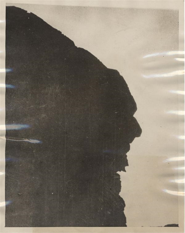 Interesting rock formation in Bear Creek, Colorado resembles the profile of our fallen President. Termed “remarkable” on original paper caption. International News stamp on verso. 8x10”. EX-MT.
