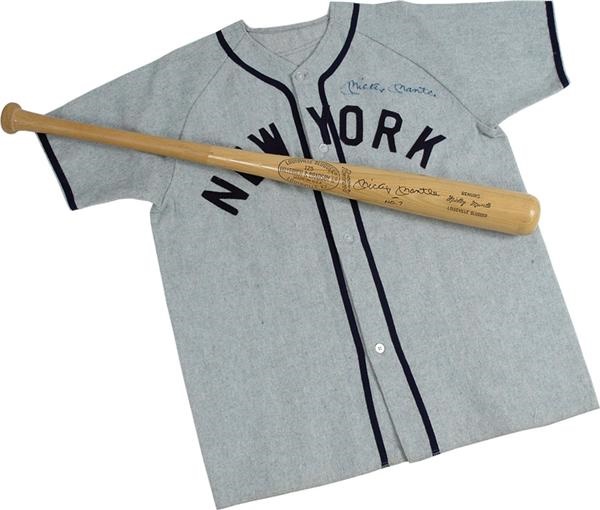 A duo of items signed by Mickey Mantle you don't see too often. "New York" grey flannel shirt has Number 7 on reverse, and sports a pretty autograph in blue on the upper breast. Rates about a 7.5/10. Size of jersey is about "Large", and is in Near Mint condition. Mantle H&B store bat measures 34" and has a nice signature in black Sharpie (8/10), with "No. 7" added by him in great location. Bat is in Excellent shape overall.