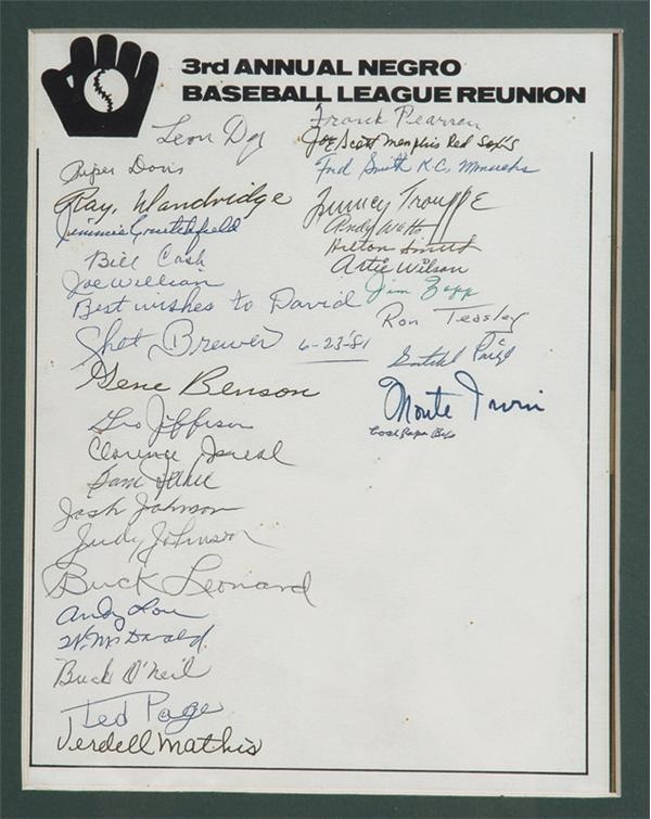 "3rd Annual Negro Baseball League Reunion" sheet has 31 bold signatures in various inks. Some terrific names here: Hilton Smith, Satchel Paige, Buck Leonard, Cool Papa Bell, Ray Dandriege, Judy Johnson, Leon Day, Monte Irvin, Ted Page, Buck O'Neil, Chet Brewer and Jimmie Crutchfield are the most notable. Matted and framed with group of Negro League Baseball Stars cards, and invitation/ticket to the June 23, 1981 event held in Ashland, Kentucky. Near Mint condition overall.