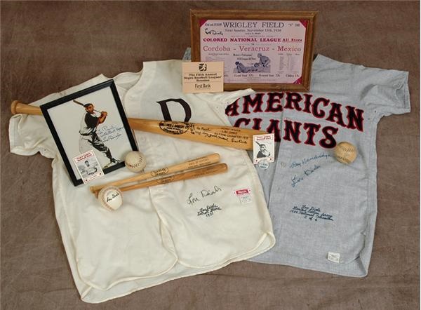 The largest collection of ink and ephemera from an assortment of Negro League stars to be offered in some time: 1) Three large reprinted broadsides (overall EX-MT), measuring 14x22", 18x24", and 20x23", each with over two dozen felt tip and Sharpie signatures. These Mint autographs include: Gulley, Mathis, Leonard, O'Neil, Benson, Irvin and Duckett. Lou Dials signed pieces: 2) His American Giants jersey signed by him and Ray Dandrige. Blue Sharpie sigs. are 7.5/10, jersey is Mint. 3) Lou Dials signed Detroit Stars flannel jersey- autograph is 7/10, jersey is EX-MT. 4) Single signed H&B model bat inscribed, "To Paul-My very good friend. Lou Dials" in black sharpie (8/10). Bat is EX-MT. 5) Reprinted 1938 ad signed by Dials in black Sharpie (6/10). 6) 8 x 10" inscribed by Dials, "To Paul-With Best Regards. Lou Dial" in blue felt tip (8.5/10). 7) Single signed Dials baseball-black Sharpie (8/10), ball is EX. 8) 11x17" reprinted broadside (EX+-EX-MT) autographed by Dials in blue felt tip (9/10). 9) Two Dials signed cards-autographed in blue ballpoint (8.5/10), cards are EX-MT. 10) Buck Leonard and Monte Irvin autographed "playground" balls-sigs. are 6/10, balls are VG. 11) Two Louisville Slugger mini bats from the Negro Baseball Hall of Fame-NRMT. 12) N.Y. Black Yankees vintage button (1")-EX+. Signatures obtained in person at reunions held in Ashland, KY.