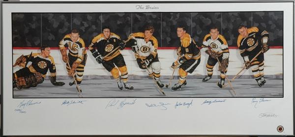 Seven greats of the Big Bad Bruins have signed this limited edition print. Measuring 18 x 39", this is number 499/1000, and is penned with autographs of Gerry Cheevers, Milt Schmidt, Phil Esposito, Bobby Orr, Johnny Bucyk, Woody Dumart and Ferny Flaman. The artist also signed in pencil. Near Mint to Mint in frame.