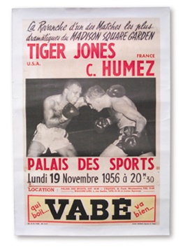 Rare French poster pits the Tiger versus this French champion. Mounted on linen. It is from their Madison Square Garden fight now playing in France by popular demand. Attractive advertising at bottom, super images of the fighters. EX+.