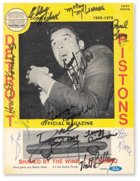 The cover of this 1969-70 game program is signed by all eleven of these cage greats in black marker and ink. Includes: Dave Bing, Miles, McLemore, Long, Komives, Workman, Reynolds, Dischinger, Moore, Walker, and Walt Bellamy. Program itself is strong EX+; signatures are NRMT. NBA team signed pieces from this era are quite tough to find.