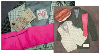 From the Lucy Show; an elegant pair of shoulder length chartreuse gloves with a faint signature and word above by Lucille Ball, along with a TV show taping ticket. 1963. From The I Love Lucy Show, your basic everyday prop satin hat, (remember this episode?) backed with a very unusual sportcoat sold in the CBS TV Studio commissary in the Fifties. The jacket has The Desi Arnaz In-Vester label as the jacket has a nifty zip out removable built-in vest.