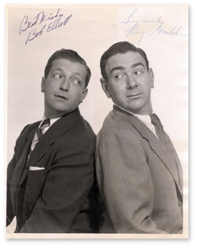 Promotional 8x10" was used for publicity for their early and groundbreaking 1950's television show. Signed "Best Wishes Bob Elliott and Sincerely Ray Goulding." The voice of the Piels Beer men, Elliott later birthed David Letterman junkie Chris Elliot. Minor soiling and small corner crease overall excellent.