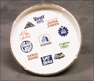 A scarce 20th Century Fox Television ceramic cigarette ashtray. It advertises the 1966 season that included Batman, Lost In Space, Voyage to the Bottom of the Sea, and supersoap Peyton Place. NRMT.