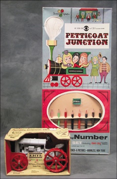 This toy combo is based on creator Paul Henning's hit Appalachian based sitcoms. Featured these extremely rare toys; Petticoat Junction. Pencil by Numbers Coloring set. Mint and sealed it measures. 9x19". Plus a terrific appropriate Green Acres Ertl die-cast metal tractor (7") MIB.