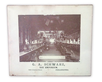 Magnificent photograph shows "G.A. Schwartz Toy Emporium 1006 Chestnut Street Philadelphia" as imprinted on the 15x13" cardboard mount. Shows a fantasy toy store with dolls, buggies, china, glass and more. Marvelous image and a definitive portrait that probably hung in the store itself. We do not know if there is any connection to FAO Schwartz. EX.