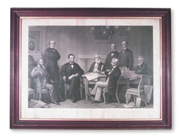 Spectacular steel engraving of Abraham Lincoln and his cabinet is a print lover's dream. It is subtitled, "From The Original Picture Painted At The White House in 1864." Below it is dated "1866" with the name of the New York publisher E.B. Carpenter. The detail is striking. Lincoln looks supremely presidential and the cabinet is at his liege. The engraving is signed by A.H. Ritchie, a true genius. Print is dirty but could be easily cleaned and would then sell for at least $2,000 in that condition if you could find one. Original walnut & gold leaf frame is gorgeous, measures overall 31x41".