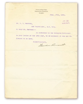 Roosevelt letter is on stationery as Governor of New York to Gilbert Harroun. It is three lines regarding an undelivered telegram. Telegram in question regards organization that Harroun championed called the "Cuban Educational Association." This was for Cuban students to be educated in the United States. There are twenty-four other letters and documents in this archive all relating to Mr. Harroun, Admiral Dewey & the Spanish-American War, Cuba and/or the organization. Letters include: Tomas Estrada Palma who in 1902 became the First President of Cuba (1902 ALS on "Delegacion Cubana" stationery r.e. donation he is giving), two from Major General Joseph Wheeler the famed Confederate Officer and Spanish-American War General (1902 TLS r.e. sketch on Harroun, and 1899 ALS on House of Representatives stationery r.e. the organization), Edward Everett Hale author of Man Without A Country (1900 TLS r.e. being on the committee). Overall VG-EX. T.R. letter has a few professionally repaired minor tears o/w EX with Mint sig.