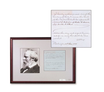 Timely piece because of the recent pardons by William Jefferson Clinton as outgoing President. This was also done by an outgoing President (Hayes) in his final months in office. Dated March 25, 1880. This is even more unusual as it is for a woman. Handwritten 7x7.5" letter written out for him, authorizes the pardon of "Martha A. Mason alias Martha A. Pollard." Mint signed at the bottom by "R.B. Hayes." Slight browning to top edge o/w Mint. Beautifully framed with real photo of Hayes, overall 21.5x16".