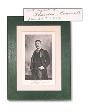 Exceptional 18x11" photogravure is "Copyright 1899 by Geo. B. Rockwood." One of the classic images of Teddy shows this powerful man dapper in very New York suitcoat, stunning watch fob, and trademark monocle. Most importantly, it is signed in the clean white border, "With Regards of Theodore Roosevelt November 24th 1902." This was signed about a year after the assassination of President McKinley and the thrusting of T.R. into the office he mastered. In vintage wood frame in original green paint that gives this piece even further antique dimension. Overall 26x20". Signature is slightly bled but is as dark as they come and o/w Mint.