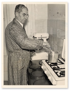 Attached caption says it all: "Luciano repairs to the kitchen for a chore at the range. He doesn't have to worry about how to pay the grocer, either. The police report said he has real estate holdings, receives large sums of money from 'American gangster friends.'" EX-MT.