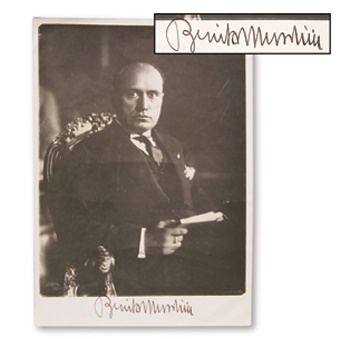 One of the finest Mussolini signed photographs you will see. Stunning image of El Duque is 12.5x9" and sports perfect contrast. Cartouche at bottom is in Italian and from a top photographer there. Signature is Mint and as dark as they come, as was this fascist's effect on our world.