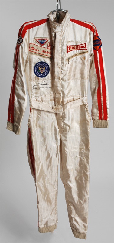 Worn during the 1970 Indy car season, his white nylon one-piece with red shoulder and sleeve trim was manufactured by the Worth Company. The left sleeve is adorned with their sponsorship patch, the right with one from "Castro GTO Motor Oil", and others running down the left breast were removed during that time. Signed by the legend of the blacktop in similar color sharpie, "Mario Andretti-Driver of the Century" just above his chain-stitched name on the right breast. This title was well deserved as he was just a year removed from his 1969 victory at Indianapolis and had recently droped the flag at the Sebring 12-Hour. The overall condition excellent, with obvious and extensive race usage.