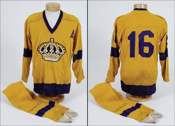Joyal was a pretty talented offensive player who in 1964 helped the Detroit Red Wings reach the 1964 Stanley Cup final. In Game 5 of the finals, he scored the winning goal against Toronto's Johnny Bower, giving his team a 3 games to 2 edge in a series they failed to close out. When expansion came along it helped Joyal's career. He was claimed by the Los Angeles Kings and enjoyed five impressive years there. His jersey offered here, from that season of 1967-68, is one of the true "firsts" you'll ever find. Worn during their inaugural preseason, this genuine "1st Set", has the Kings majestic crown on the front just below his assistant captain's "A". The sleeves and reverse have his number "16." Rawlings tag is missing from tail though the overlapping "V" style neckline is a clear indication that it's a first year Kings jersey. Very few of these have survived, as many went down to the minors. A real find for vintage collectors. Excellent condition.