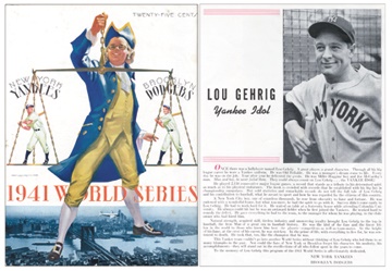 Insert from the famed Mickey Owen dropped third strike Series dates from just months after the Iron Horse lost his battle with the disease bearing his name. Rare insert folds out to poster size and regards mainly the upcoming film, "The Pride of the Yankees." Photos of Gehrig and his wife are joined by text by such reporters as Bob Considine, most famous for his Babe Ruth biography. Yellowing tape along two edges, otherwise EX.