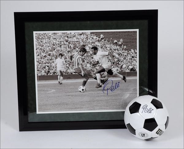 Great black and white photo of Pele scooting past a defender who looks as lost as he can possibly be. He could take solace in that so many had been undressed in similar fashion. Both are signed in 10/10 Sharpie. Both items are MINT. Signatures obtained through in-person signing. Photo (20 x 16") is framed (27-1/2 x 23-1/2") and matted.