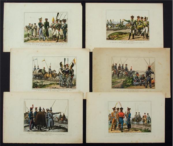 Fantastic presentatiion of 9 groupings (124 in-all) of hand colored prints and engravings during the Great Wars of the early 19th Century including Napoleon. Follows is a nutshell description of each grouping: 1) Thirty one French engravings of Warriors on their mounts by Chez Martinet 7 x10”. 2) EX 19 x 11” watercolor print of General LaSalle by V. Huen. 3) Group of 8 original hand colored prints depicting the life, glory and death of Napoleon, in small format 14 x4”, EX. 4) Set of six color engravings depicting Russian Sharpshooters, Fusiliers, Dragons, Currassiers and Cossacks, all in EX measuring 9 1/2 x 14”. 5) Large grouping of 32 splendid hand-colored 5 x 8” French restoration plates, drawn and engraved by Canu (Paris 1816-25). 6). Major lot of 39 hand-colored images of Allied troops from second restoration published by Chez Genty, Paris (1816) EX, 8 1/2 x11”. 7). Two gorgeous hand-colored original prints depicting Veterans of the Armee of Italy and Napoleon with a line of Grenadiers, EX 9 1/2 x 12”. 8). Four color prints published in London in 1815 by J.Jenkins depicting four British views of the Campaign in Spain 1808-13, EX 11 x 14”. 9) Large 11 x 17” well known, poster like watercolor caricature of Napoleon as a Monster, published in England in 1814. Fantastic original color print collection!