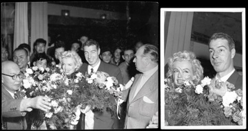 Two impressive images of Joe & Marilyn at the Imperial Hotel in Tokyo. They are there for their honeymoon. One is 5x7" and the other 7.5x9". Honeymoon made famous in the Richard Ben Cramer DiMaggio book. Marilyn left for Korea to entertain the troops and left Joe fuming. EX-MT.