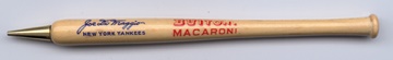 Advertising and promotional piece for the 1952 television show The Joe DiMaggio Show. Done in concert with the New York Yankee broadcasts, this was Joe's $100,000 job after his career as a player. Sponsored by Buitoni Macaroni, the piece is wood with the name of the company in red (to match the sauce) and with his facsimile signature "Joe DiMaggio" and "New York Yankees" on the barrel. NRMT, 6" long. Rare.