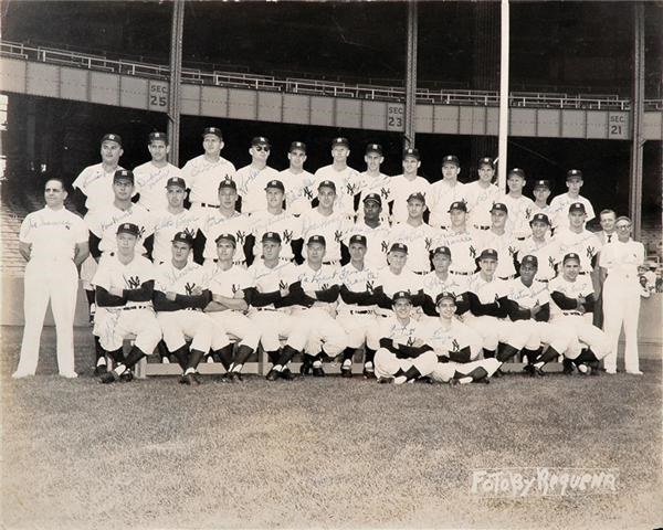 Stunning image of the 1960 World Champion team with slugger Mickey Mantle and the new kid in town Roger Maris. Amazing 27 total signatures also sports Berra, Howard, Ford, Lopat, Houk, Crosetti, Skowron, Wooding, Boyer, Kubek, Duren and the rest. No Stengel but you can’t have everything (even the batboys are here). Louis Requena original photo (with his front cartouche and vintage back stamp) is 7/10, sigs are 8/10.