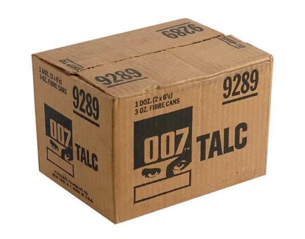 In "From Russia With Love," 007 uses an exploding tear gas cartridge disguised as a tin of talcum powder. Colgate-Polmolive, who just happened to make talcum powder themselves, thought that this was a good enough reason to promote their line of talcum power using the image of 007. This sealed case is complete with a dozen 3oz cans and is in MINT condition.