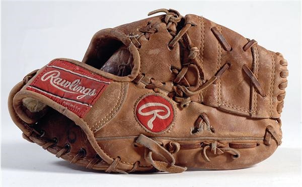 Long before he was patroling the outfield for New York, even before he was a hot tempered rookie with the Brewers, Gary Sheffield donned this Rawlings “Pro-5X-SC” as a promising prospect in the Milwaukee farm system. The tan leather is well broken-in but still soft and supple, and is written with his number “16” in black marker inside the palm. Signed and inscribed in blue sharpie, “Used in Minor Leagues-Gary Sheffield” (9/10). Tremendous use is evident throughout.