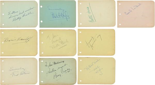 Amazing collection of vintage autographs penned by entertainers of every variety during the height of their fame. Boris Karloff, Carole Lombardi, Bing Crosby, Milton Berle, Helen Hayes, Bob Hope (2), Fred Astaire, Betty Grable, Spencer Tracey, and twenty others (30 total) have individually signed 4.25x6" album pages in either fountain or ballpoint pen. Collectively, the group grades an "8" out of possible "10" with a number of finer examples. The blue and cream colored sheets on which they exist are lightly toned from age and all have a left to right center crease, overall EX. LOAs are included for most.