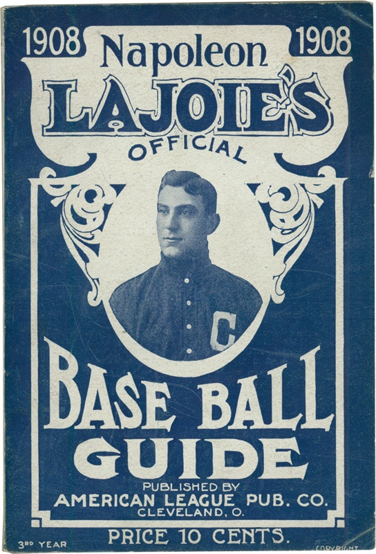 Offered is a 1908 "Napoleon Lajoie's Official Base Ball Guide", with a blue and white cover boasting an image of the Hall of Fame second baseman . Amazingly, Lajoie published these manuals -- as president of the American League Publishing Company -- while an active player, making him the AL's answer to Al Spalding. Guide is 4 1/2 x 6 1/2" (288 ppg) and amongst the finest we have ever come across. Completely intact, with only minor creases to the cover corners, and pages that are absent of the often seen toning. Overall EX+.