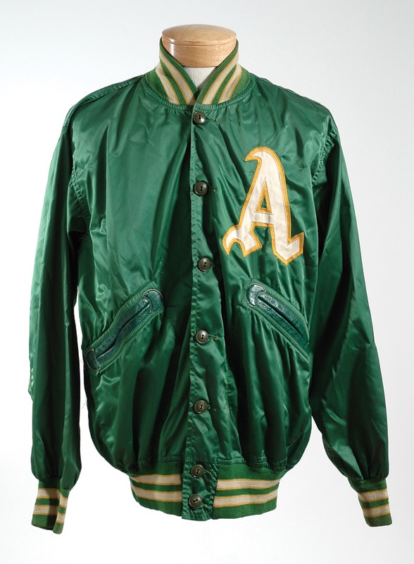 Baseball running through his veins, DiMaggio found it difficult to stay away from the field even after his retirement from the Yankees. A few short years after he returned to his home state he found himself once again at the stadium, though this time as a member of the Athletics’ Board of Directors. Even if he was a suit and tie guy at this point that didn't prevent him from taking the field once and a while and it certainly didn't stop young prospects from seeking out his advice. It was while doling out tips on hitting and fielding to this eager audience that he donned this green satin player's jacket. Customized with his legendary number "5" above the cuff of the left sleeve and sewn with Oakland's "A's" logo on the left breast, with a collar is tagged from Wilson ([size] "46" flag tag). One of the very few non-Yankees affiliated items to ever surface, this rare garment exhibits nice use though remains in excellent display condition. Ex-Dick Dobbins Collection.