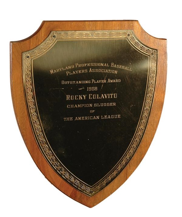 After batting .303 with 41 home runs (one behind Mickey Mantle's league lead) and 113 runs batted in, Rocky finished third in the AL MVP balloting. He would not go home empty handed though. His .620 slugging average put him atop the AL and earned him this handsome piece of hardware. The gold plaque is engraved, "Maryland Professional Baseball Players Association-Outstanding Player Award-1958-Rocky Colavito-Champion Slugger Of The American League" (the MPBPA is the same organization responsible for distributing the Home Run Crowns each year). Only minor surface scratches prevent this piece from being graded higher than EX+-EX-MT. Obtained directly from Colavito.