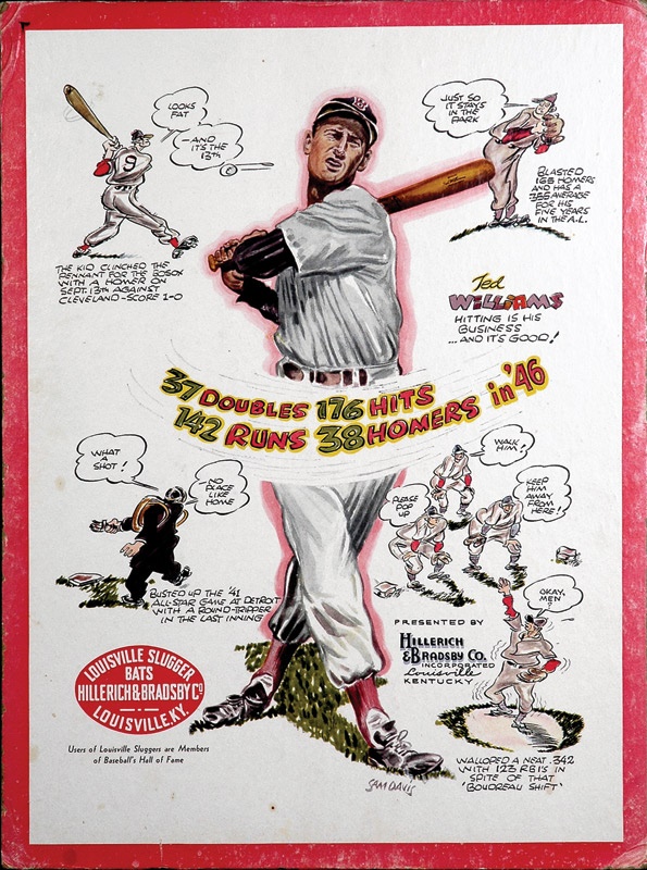 "Ted Williams-Hitting is his business...and it's good!", reads this handsome countertop sign from Hillerich & Bradsby featuring a fantastic illustrated image of "The Splinter" by Sam Davis. Surrounding him are comic-type images of his opponents alongside highlights of his young career. Light wear and minor creasing to some corners along with mild fading, stand on back is fully intact, EX. Measures 15x20"