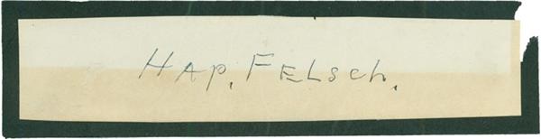 Arguably the most rare and sought after of the banished bunch, direct from the collection of Charlie Sheen (who ironically starred in the movie based on those very events). The cut sheet, which displays toning on the lower half from age, is signed, "Hap. Felsch" in blue ballpoint ink that grades a "9" out of perfect "10". Mounted to a 7x2" black page of heavier stock that was originally cut from a scrapbook.