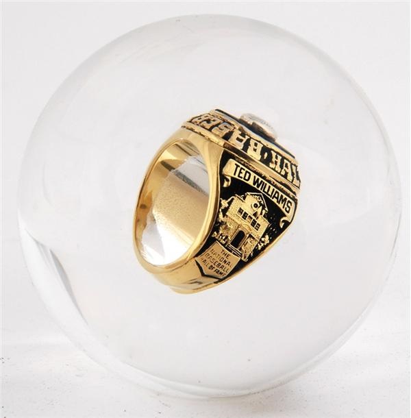 Encased in this crystal clear lucite globe is the very same model ring Ted Williams was presented with upon his induction into the Hall of Fame. Exact in every detail, its face displays a silver baseball set into a sleek black stone, surrounded by "Baseball Hall Of Fame" in raised text. On the right shank, "Outfielder" is engraved to a raised banner above a bat and ball design followed by a second engraving that reads, "Elected 1986". The left shank boasts a design based on the actual Hall, along with two more raised banners that are engraved, "Ted Williams", and, "The National Baseball Hall Of Fame". Overall EX-MT.