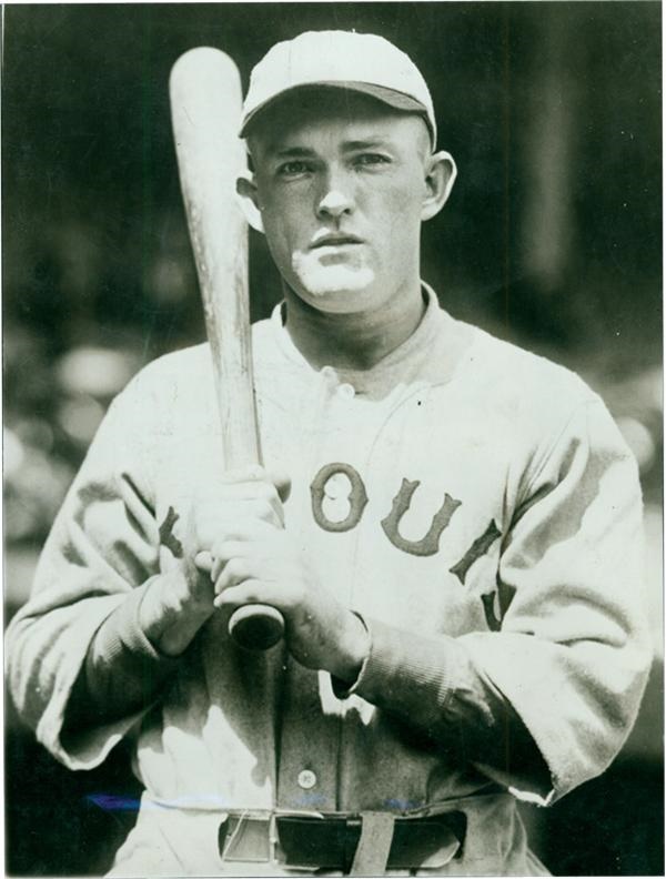 Presented is a magnificent photo of a young Hornsby taken by Culver Pictures, Inc. while he was still with the Cardinals. Posed with his bat resting on the shoulder of his St. Louis jersey, he stares into the lens of the camera with the same steely look that sent shivers down the spines of opposing pitchers. The image itself is NRMT, with multiple "Culver" stampings, his name written in ballpoint, and tape remnants on the reverse side.
