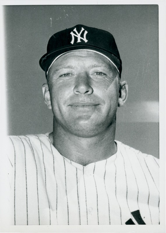One of the most recognizable photos in all of sports imagery is this remarkable specimen taken shortly after Mantle was named the AL's MVP. It would be the third time in his ilustrious career he would be awarded this honor and no better photo could mark the occassion. Perfect in terms of clarity, with nice contrast and blemish-free surfaces on front and back. Still with its orginal paper caption. NRMT-Mint.