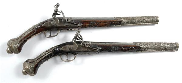 This lovely pair of flintlock Belgian pistols likely dates from the early part of the 19th century, and are constructed of steel on wooden stocks, with decorative metal plates and silver inlays. Overall length of the pistols is just over 20", and both bear an ELG proof stamp, mandated by the Belgian government. The action of one pistol is fully functional, and the other will cock but not release. The wood is cracked behind the action on one pistol, and both weapons show cracks in their metal ornaments, with occasional missing material. While we do not recommend that vintage pistols be fired, the pair will display beautifully - perfect for conjuring another time and place, perhaps at dawn... as the fog begins to lift...