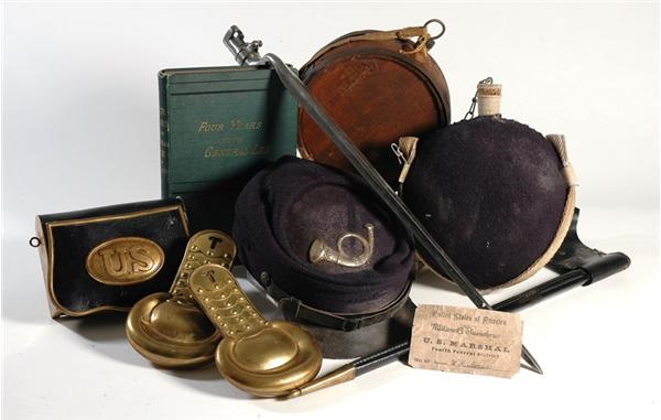 Atmospheric and overwhelming Civil War paraphernalia reproductions, including two (2) canteens - one wooden with cork, cork ring, and dual shoulder and cork strap, and the other container-metal surrounded by fabric, with cork and stopper chain; one (1) wool, officer blue kepi cap with leather visor, chin strap, and sweat band, and silver infantry insignia on top of cap, and shows great wear; one (1) very sharp silver bayonet with protective leather brass-tipped cover; one (1) book entitled “Four Years with General Lee” by Walter H. Taylor, published in 1877; one (1) black leather cartridge box with brass “US” insignia on flap, and retains leather strap to secure flap; and lastly a 4 ? x 2 ?” vintage paper ID for “William Saunders, U.S. Marshal, Fourth Federal District.” A very historic and emblematic collection.