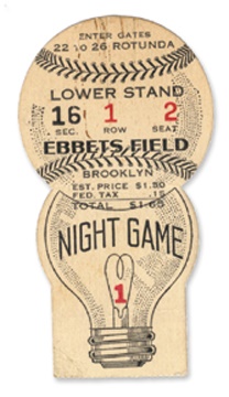 The completion of a feat never performed before or since. Four days earlier, in his most recent start against the Boston Braves, Vander Meer recorded a zero in the hit column. This day, June 15, 1938 at Brooklyn, he did it again. Stub from the famed pitcher's second consecutive no-hitter is VG-EX. This was also the very first night game held at Ebbets Field.